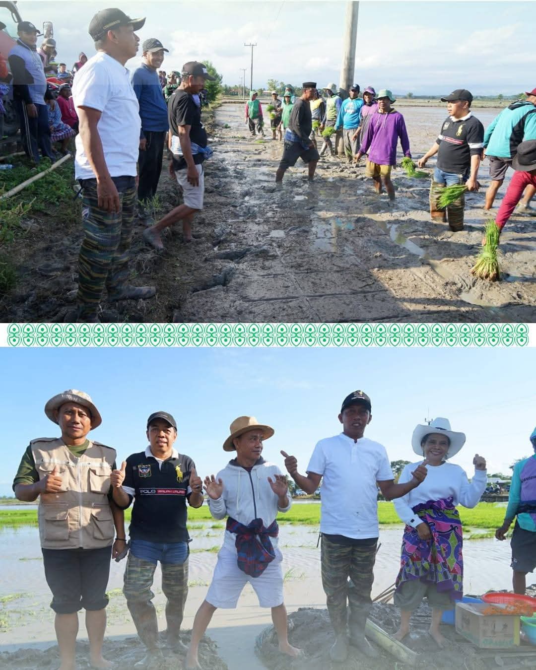 Dengan mengenakan sepatu khusus sawah, Bupati Syaharuddin memulai tanam padi menggunakan metode pindah tanam dari persemaian. Ia juga memberikan bonus kepada tiga petani tercepat dan paling rapi dalam menanam.
