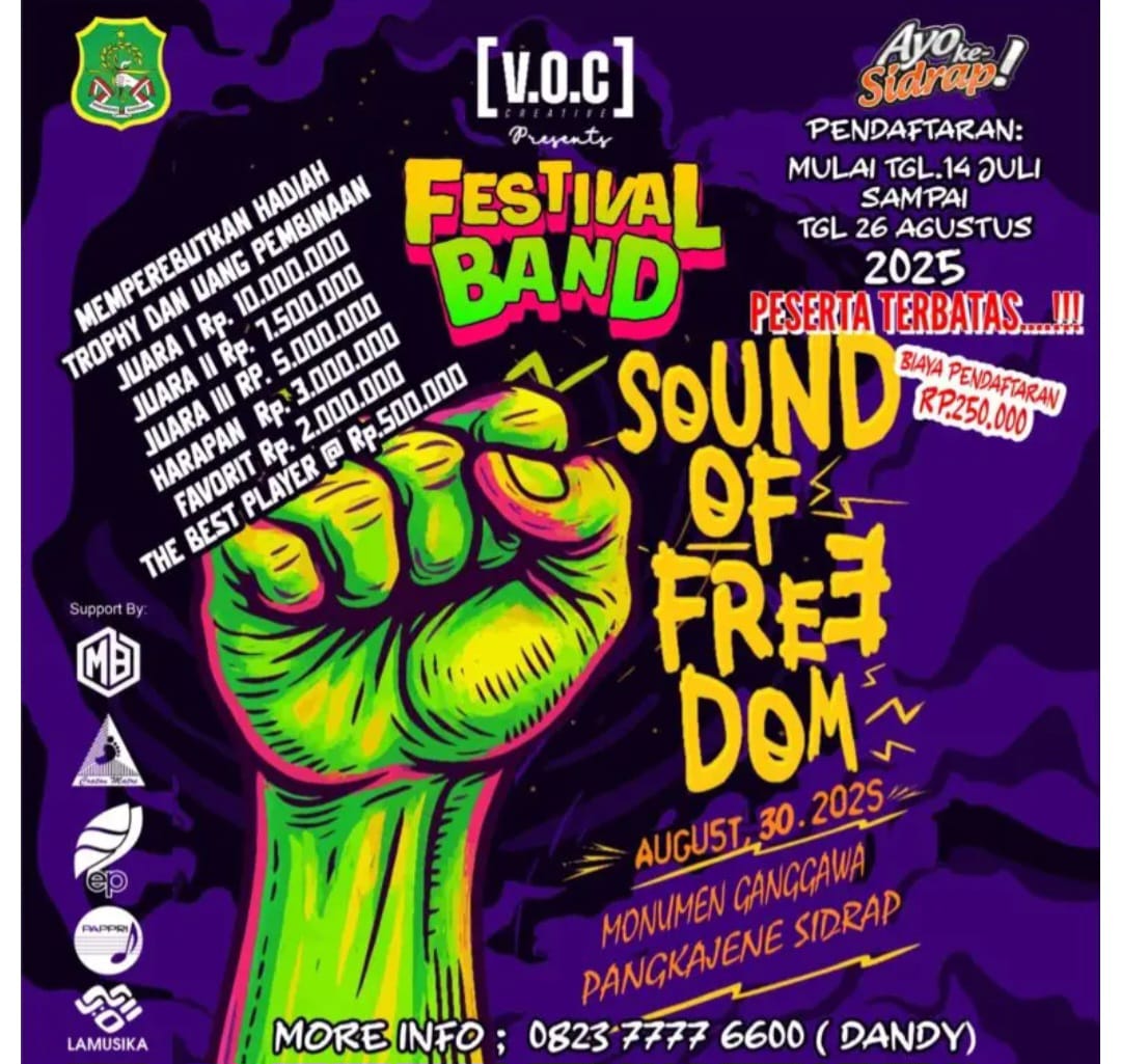 SIDRAP.KOMPAKNEWS.My.id– Ajang bergengsi bagi para musisi muda kembali hadir di Sidrap! [V.O.C Creative] akan menggelar Festival Band “Sound of Freedom” yang rencananya akan berlangsung pada 30 Agustus 2025 di Monumen Ganggawa, Pangkajene Sidrap.