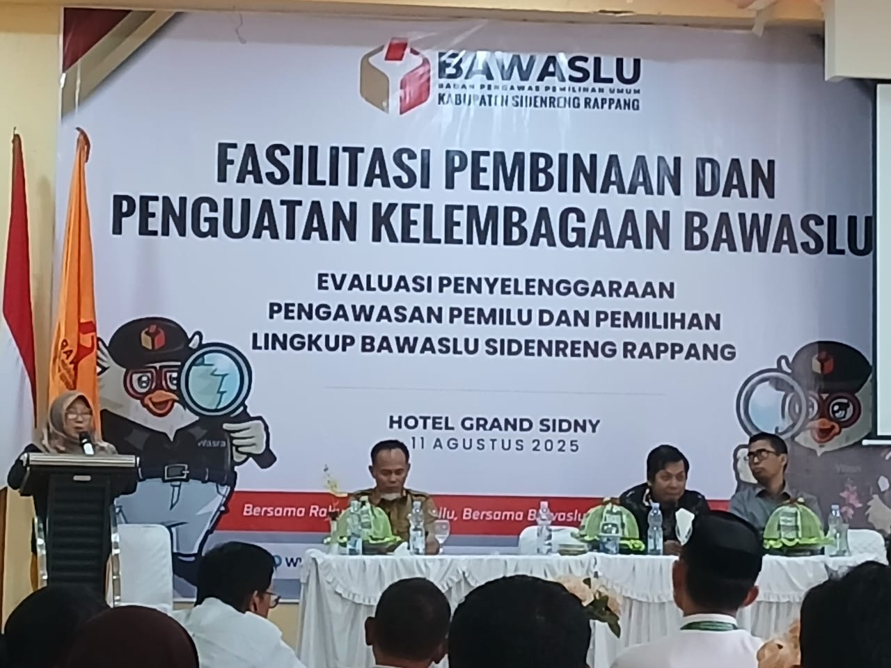 SIDRAP.KOMPAKNEWS.My.id– Badan Pengawas Pemilihan Umum (Bawaslu) Kabupaten Sidenreng Rappang menggelar kegiatan Fasilitasi Pembinaan dan Penguatan Kelembagaan, yang dirangkaikan dengan Evaluasi Penyelenggaraan Pengawasan Pemilu dan Pemilihan di lingkup Bawaslu Sidrap. Acara berlangsung di Hotel Grand Sidny, Senin (11/8/2025).